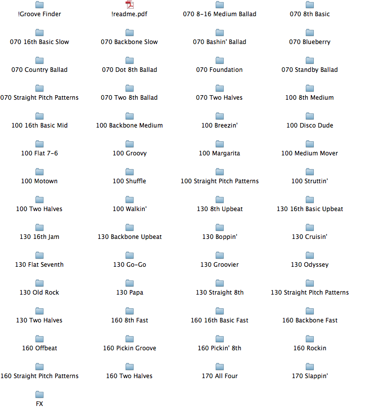 More than 1,800 loops and fills are arranged by tempo and feel into 56 BPM folders. Each groove includes a main pattern, alternates, and fills. Straight patterns come in tight and loose versions with eighths, quarters, halves, whole notes, and double-wholes. The longer notes also work well as single-hit samples for your sampler. The result is a structured library that supports the chord flow and movement of your song instead of forcing you to hunt through random riffs.